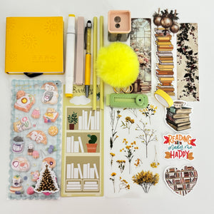 This curated box includes a notebook, pens and pencils, highlighters, trendy sharpener, washi tape, fluffy keychain and several sticker sheets with cozy books, animals and florals – everything to decorate reading journals, planners and study notes. Each Reading Stationery Gift Box is hand‑packed in a pretty gift box, ready to give for birthdays, holidays, back to school or just because.